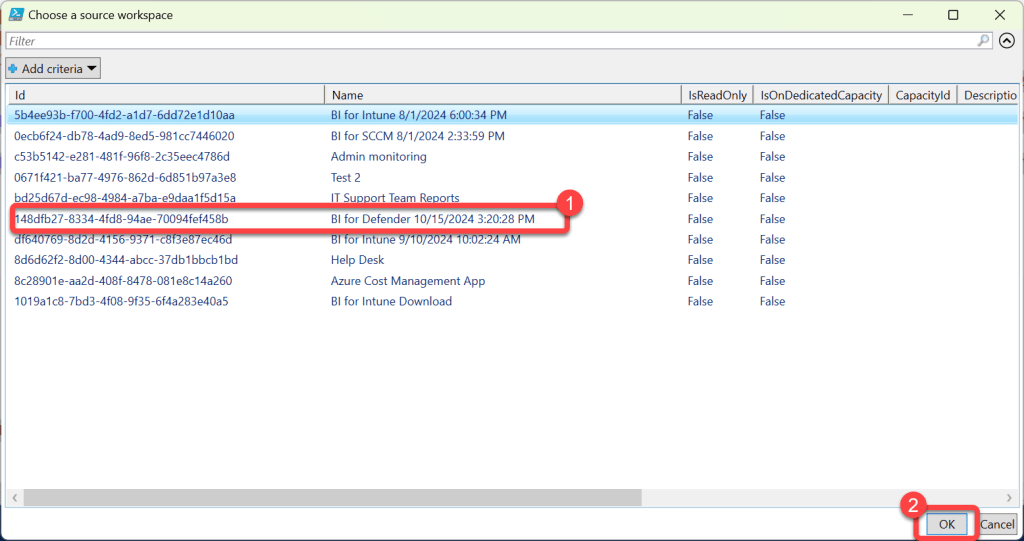- When prompted, select your production BI for Defender workspace. This is the source from which reports will be copied.