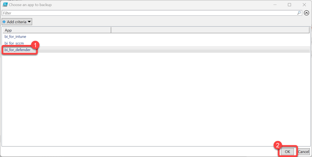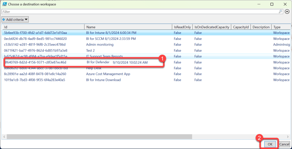 - When prompted, select your backup BI for Defender workspace. This is the destination which reports will be copied to.