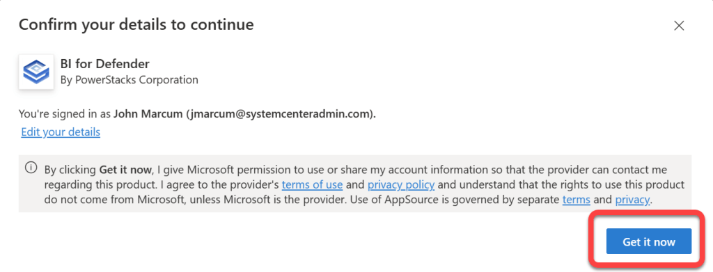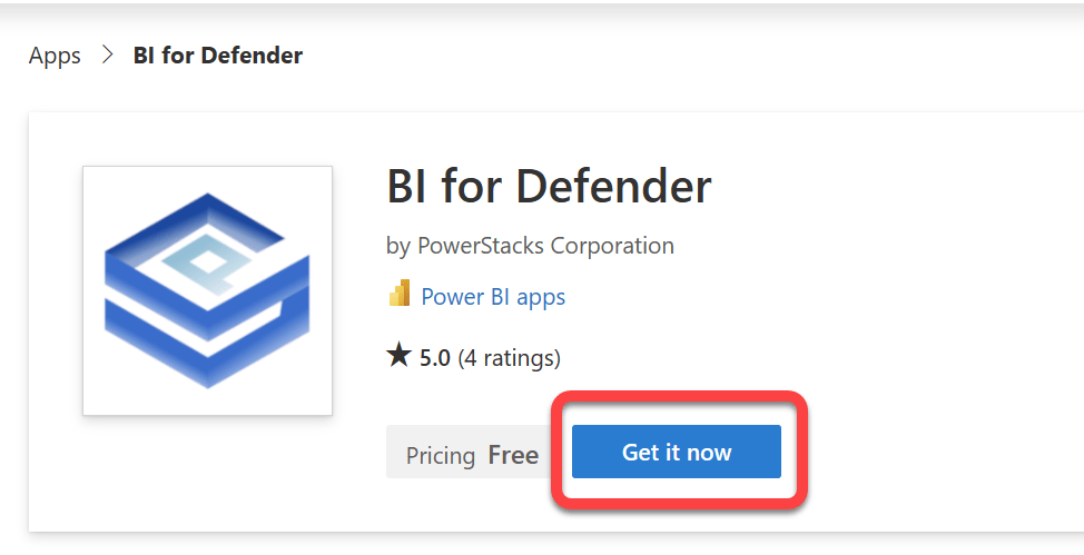 - On the BI for Defender page in Microsoft AppSource select Get it now.