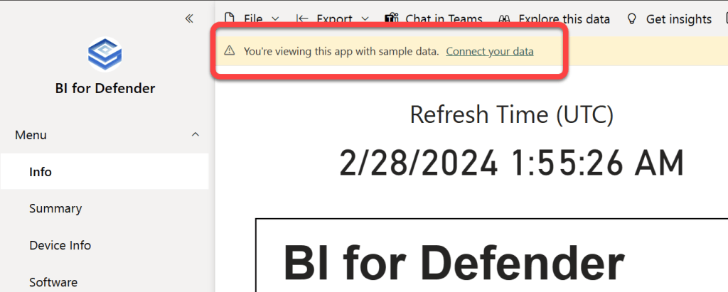 - Upon opening the BI for Defender workspace you may notice a banner that says, "You're viewing this app with sample data. Connect your data." This can be safely ignored. If you'd like to try BI for Defender before connecting your data it installs with sample data. If you prefer to go ahead and see your own data proceed to the next step in our documentation.