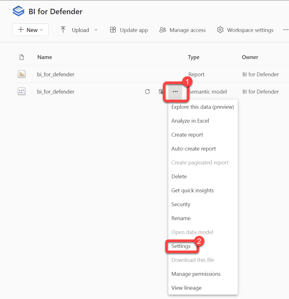- Hover over the bi_for_defender Semantic model dataset to reveal a kebab menu (three vertical dots).