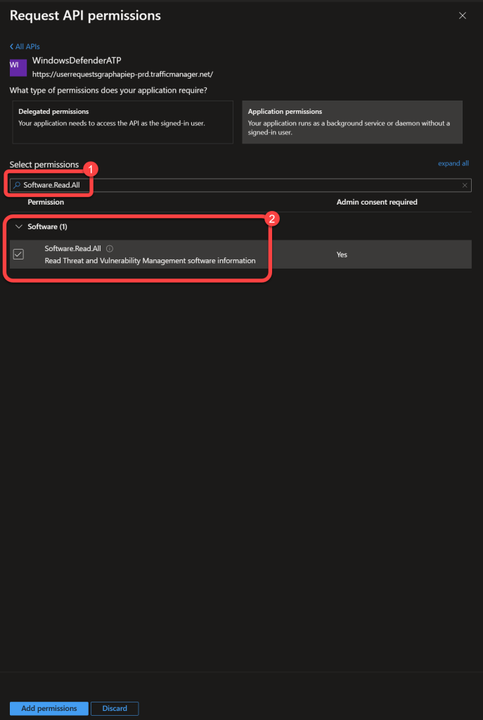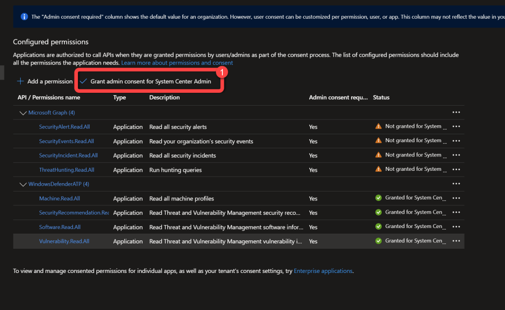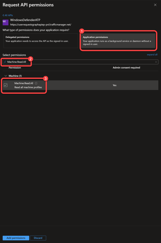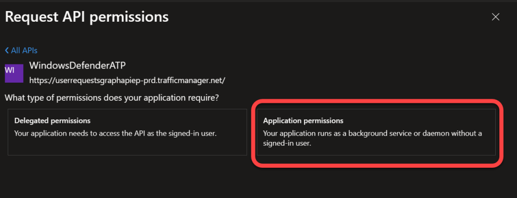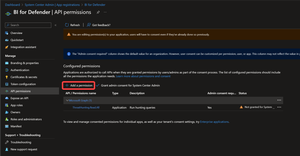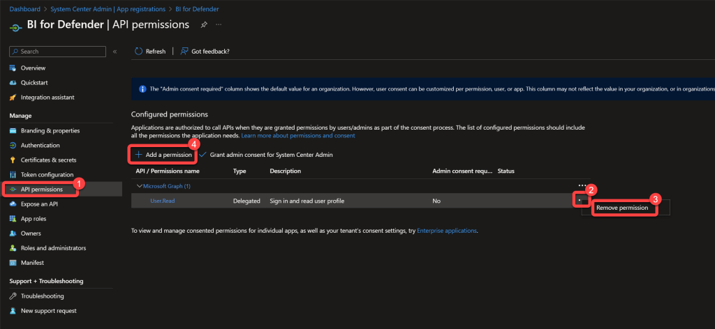 Synchronizing data from Microsoft Defender for Endpoint is done using application permissions. Here we are configuring the permissions required for Power BI to connect to the Microsoft API's to retrieve the data.