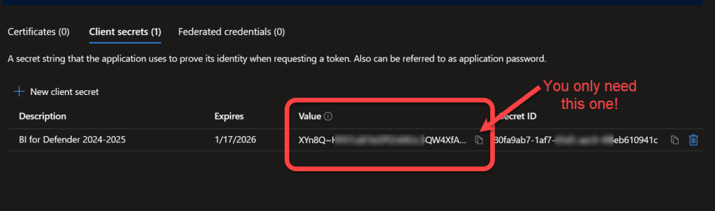 Record the Value data as the Azure AD Client Secret. This will be used later in the installation process. The value can only be displayed once, if you fail to record it here you will have to create a new one.