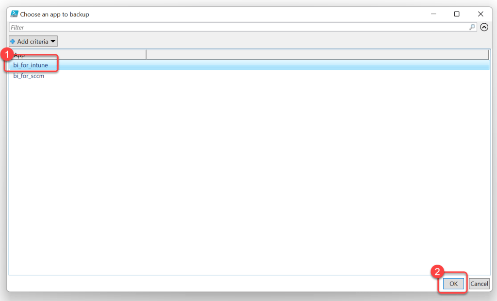 - When prompted, select any BI for Intune apps that you may want to backup. (Note: This is only required if you have created apps containing custom reports)
