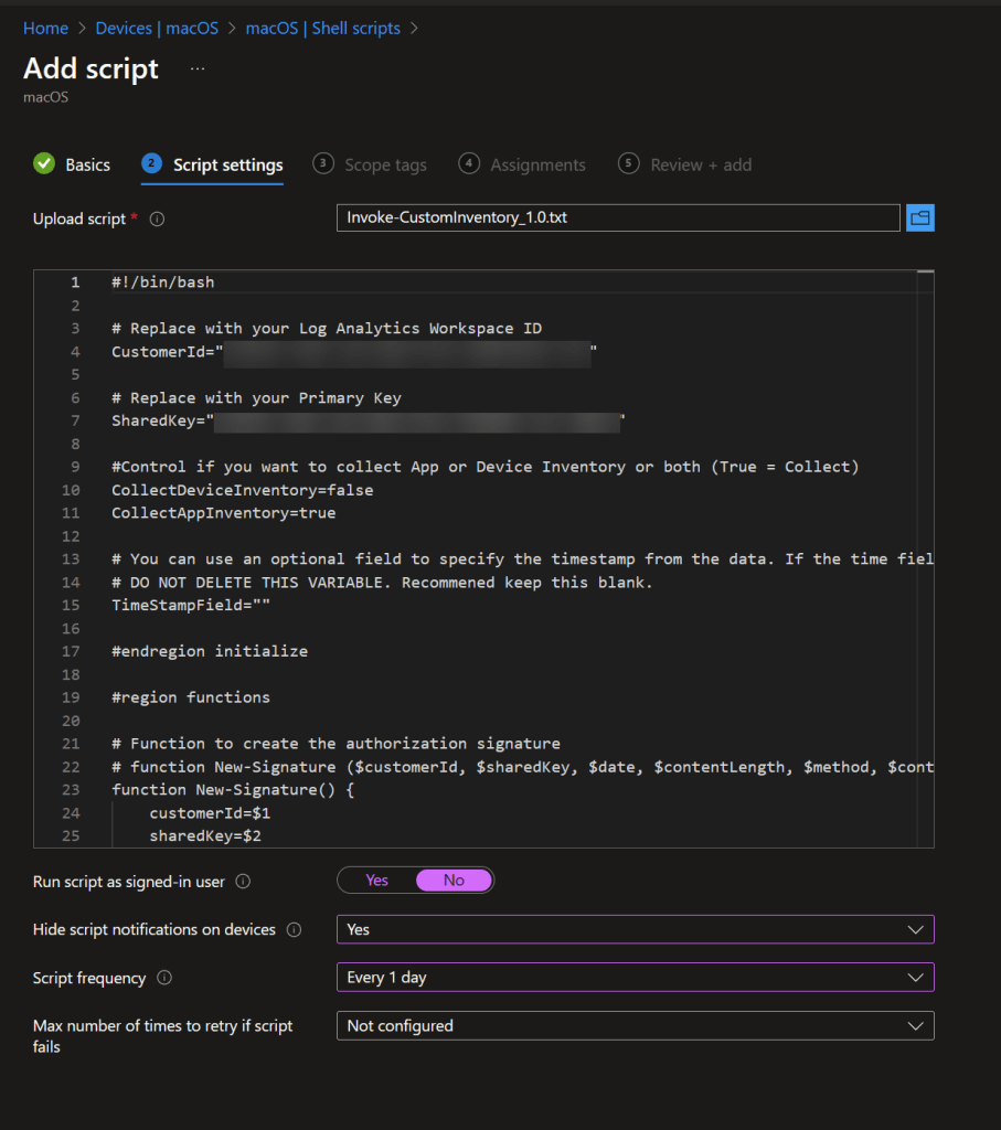 We created this script at the request of a customer. It collects the installed software from macOS and sends that to Log Analytics just like our PowerShell script does on Windows. You can deploy the script as a Shell script from Intune. Ideally the script should be run once per day on each device. This way any changes to the device get captured.