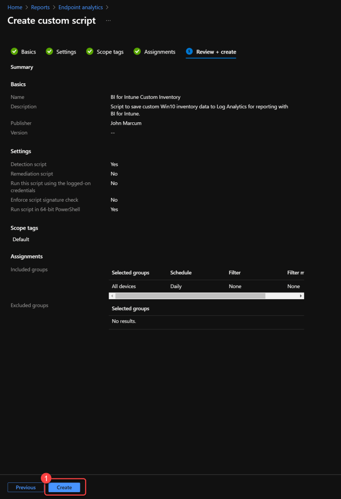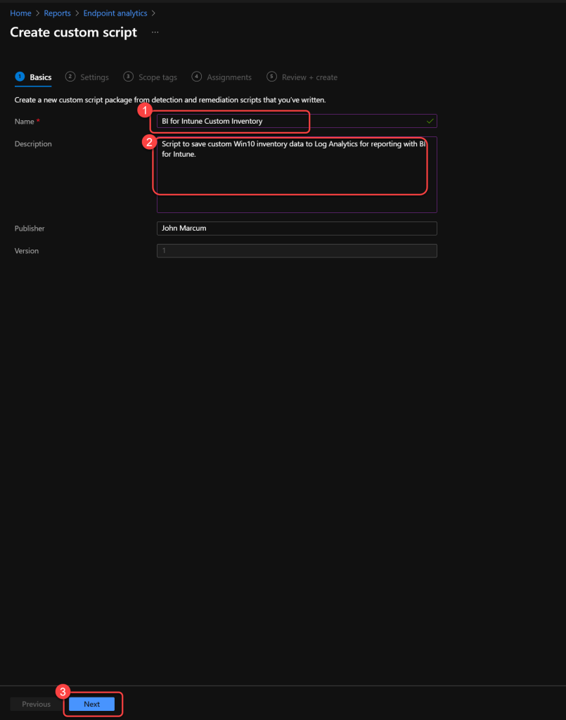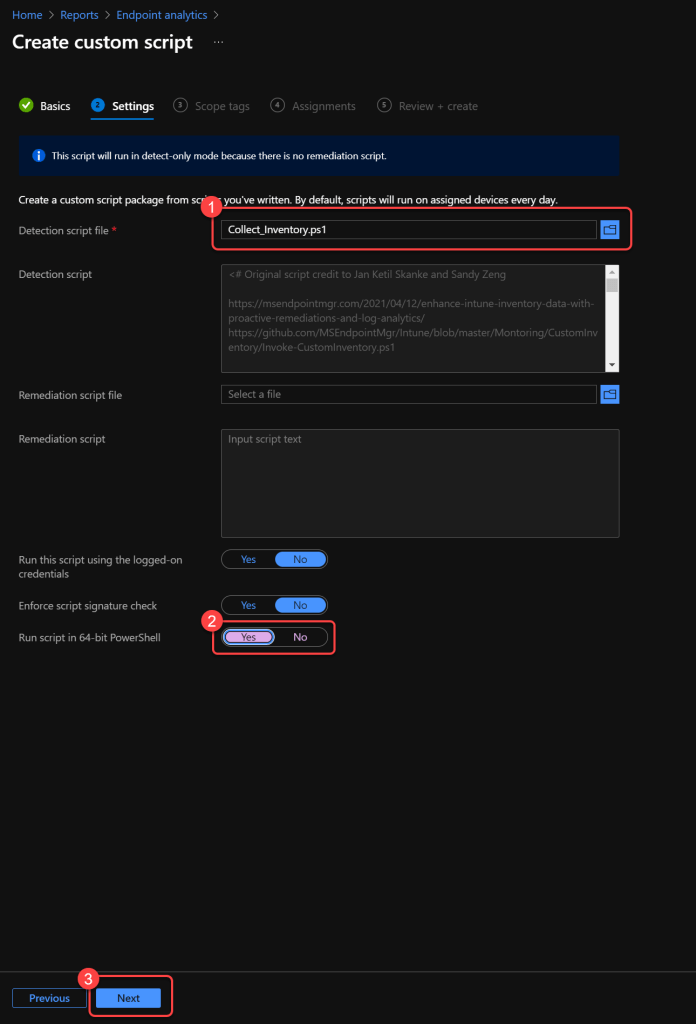 - For the Detection script file, browse to and select the Inventory.ps1 file.