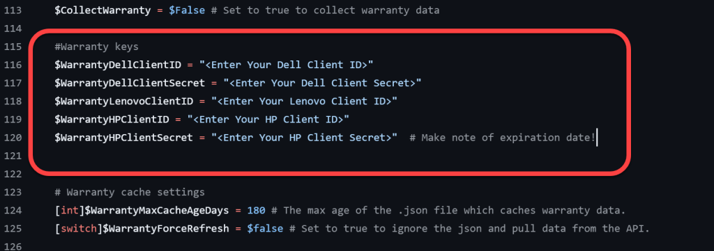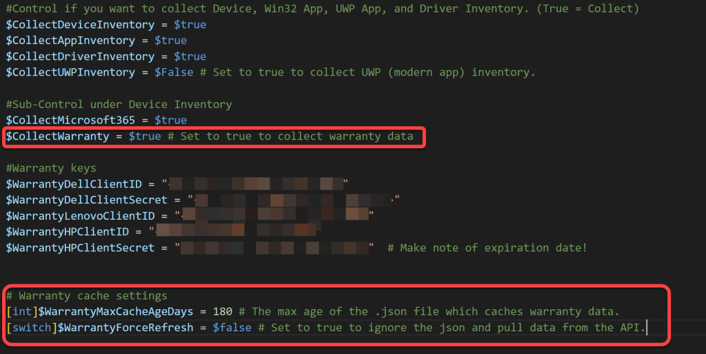 - Warranty data is cached locally on each device so that we do not make a call to the manufacturer API for each device each day. The cache is refreshed every 180 days by default. This is configurable using $WarrantyMaxCacheAgeDays. The cache can be force refreshed using $WarrantyForceRefresh.