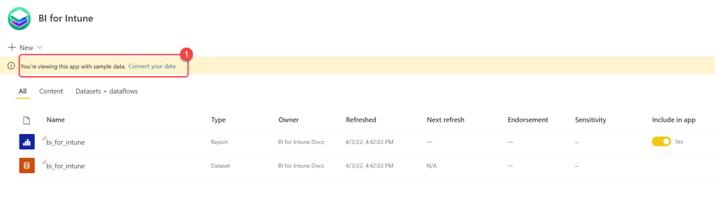 - Upon opening the BI for Intune workspace you may notice a banner that says, "You're viewing this app with sample data. Connect your data." This can be safely ignored. If you'd like to try BI for Intune before connecting your data it installs with sample data. If you prefer to go ahead and see your own data proceed to the next step in our documentation.