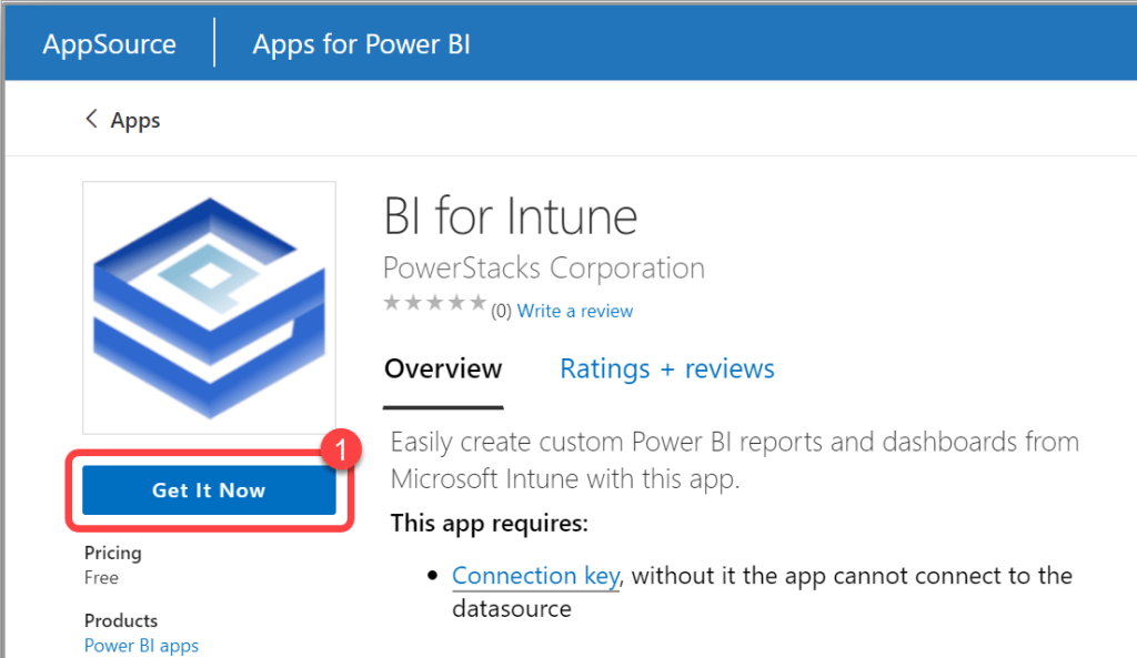 - On the BI for Intune page in Microsoft AppSource select Get it now.