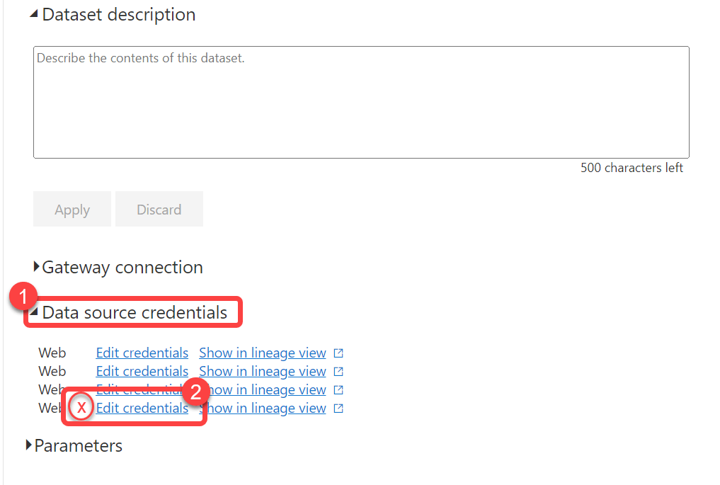 - One of the four Web data sources should have an "X" next to it, select Edit credentials on that line.