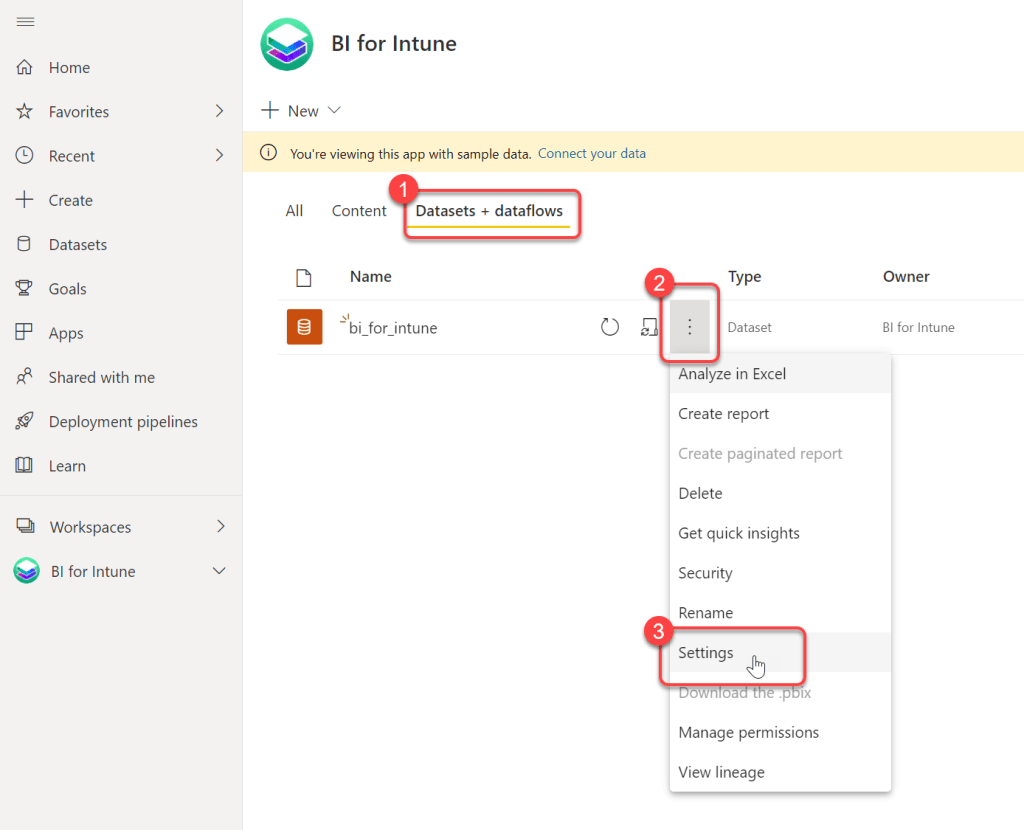 - Hover over the bi_for_intune dataset to reveal a kebab menu (three vertical dots).