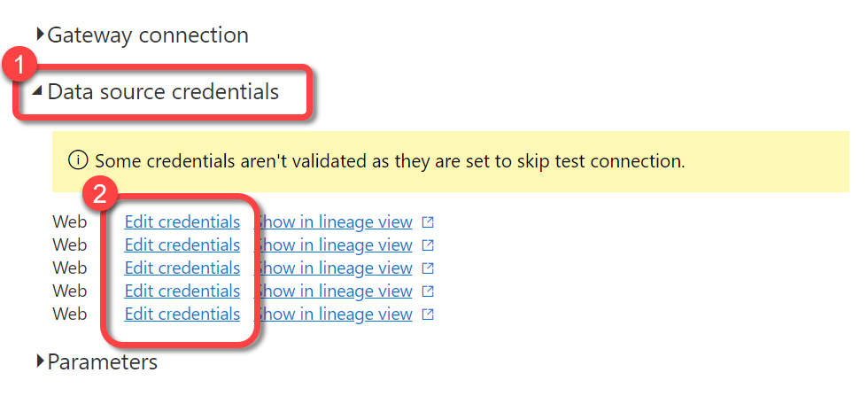 Select each occurrence of Edit credentials one by one and configure each as follows: