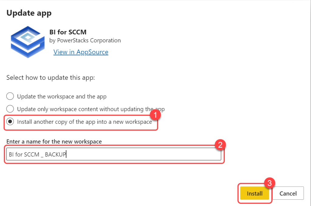 We strongly advise customers to always backup their custom reports before performing any in-place upgrades. Failure to do so could result in the loss of your custom reports! Our backup process consists of creating a new workspace by installing a second instance of BI for SCCM. There is no need to configure this instance, it's just a place-holder to which our script, documented in our "Backup Custom Reports" document, copies all of your custom reports in case something goes wrong during the upgrade. In the unlikely even that the upgrade fails it may be necessary to configure the backup workspace and move it to production. Prerequisites: The user executing these steps should be an administrator of the BI for SCCM workspace.