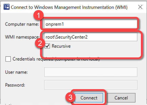- In the Connect to Windows Management Instrumentation (WMI) dialog, specify the name of a Windows 10 or 11 computer, specify rootSecurityCenter2 namespace and select Recursive.