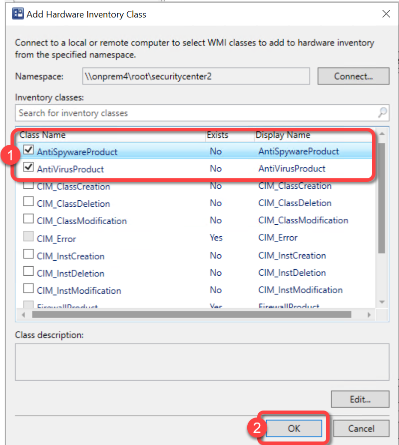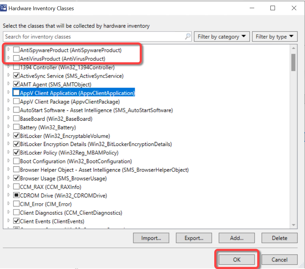 - In the Add Hardware Inventory Class dialog, Select the AntiSpywareProduct and AntiVirusProduct inventory classes.