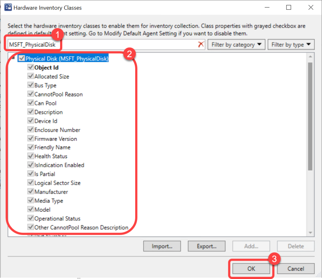 - In the Hardware Inventory Classes dialog, use the Search for inventory classes field to search for the MSFT_PhysicalDiskclass.