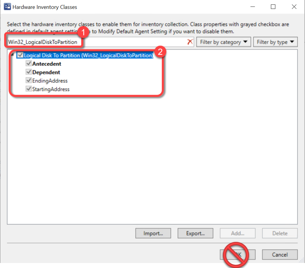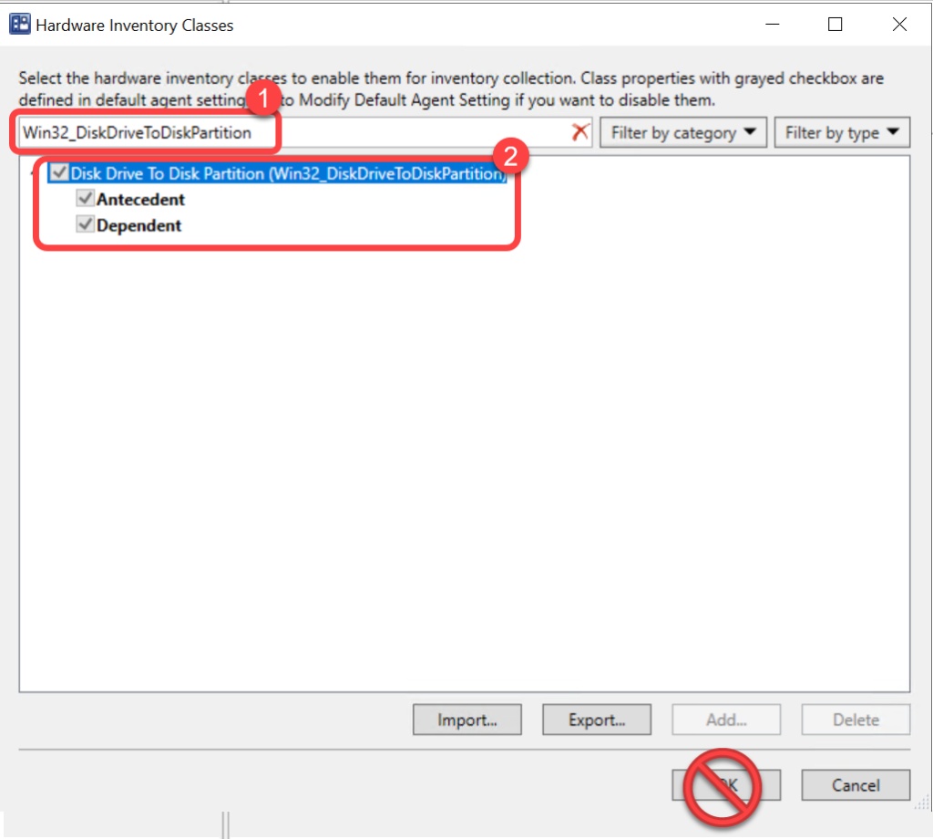 - In the Hardware Inventory Classes dialog, use the Search for inventory classes field to search for the Win32_DiskDriveToDiskPartitionclass.