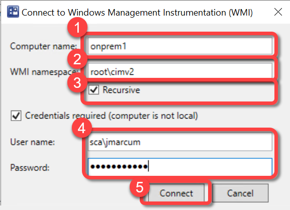 In the **Connect to Windows Management Instrumentation (WMI)** dialog, specify the name a computer that has run the PowerShell script.Do not change the **WMI namespace**, it should be **rootcimv2**.Select **Recursive**.Enter a **username** and **password** if required.Select **Connect**.