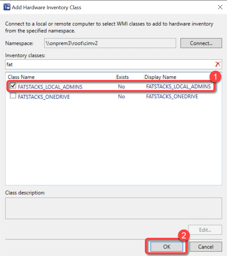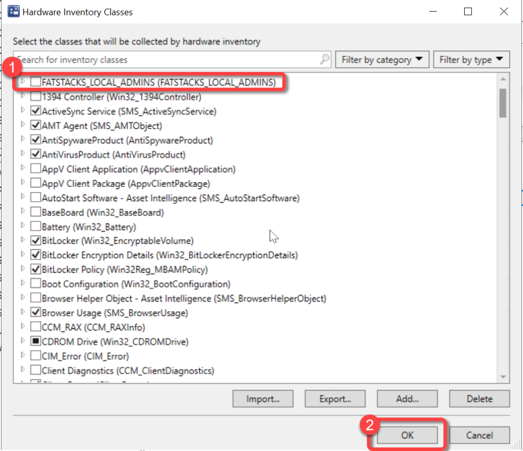 In the **Add Hardware Inventory Class** dialog, select the **FATSTACKS_LOCAL_ADMINS** inventory classes. Select **OK**.