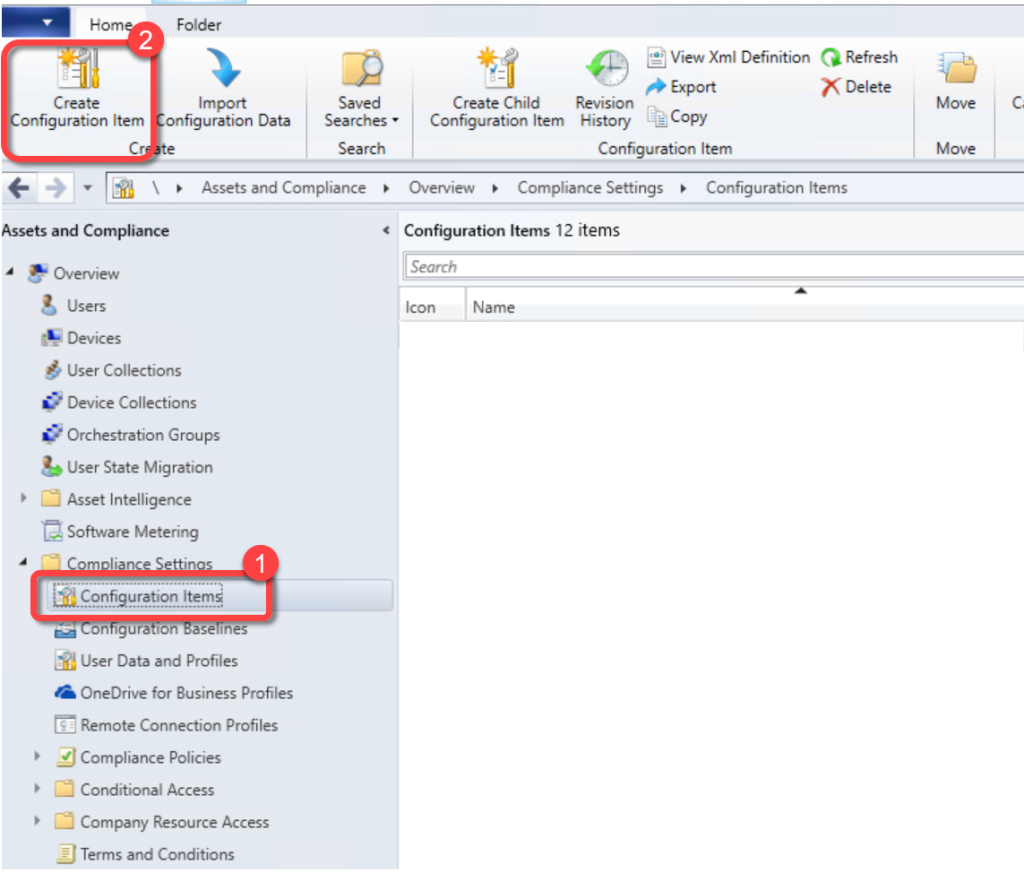 In the **Configuration Manager console**, go to the **Assets and Compliance** workspace, expand **Compliance Settings**, and select the **Configuration Items** node.On the **Home** tab of the ribbon, in the **Create group**, select **Create Configuration Item**.