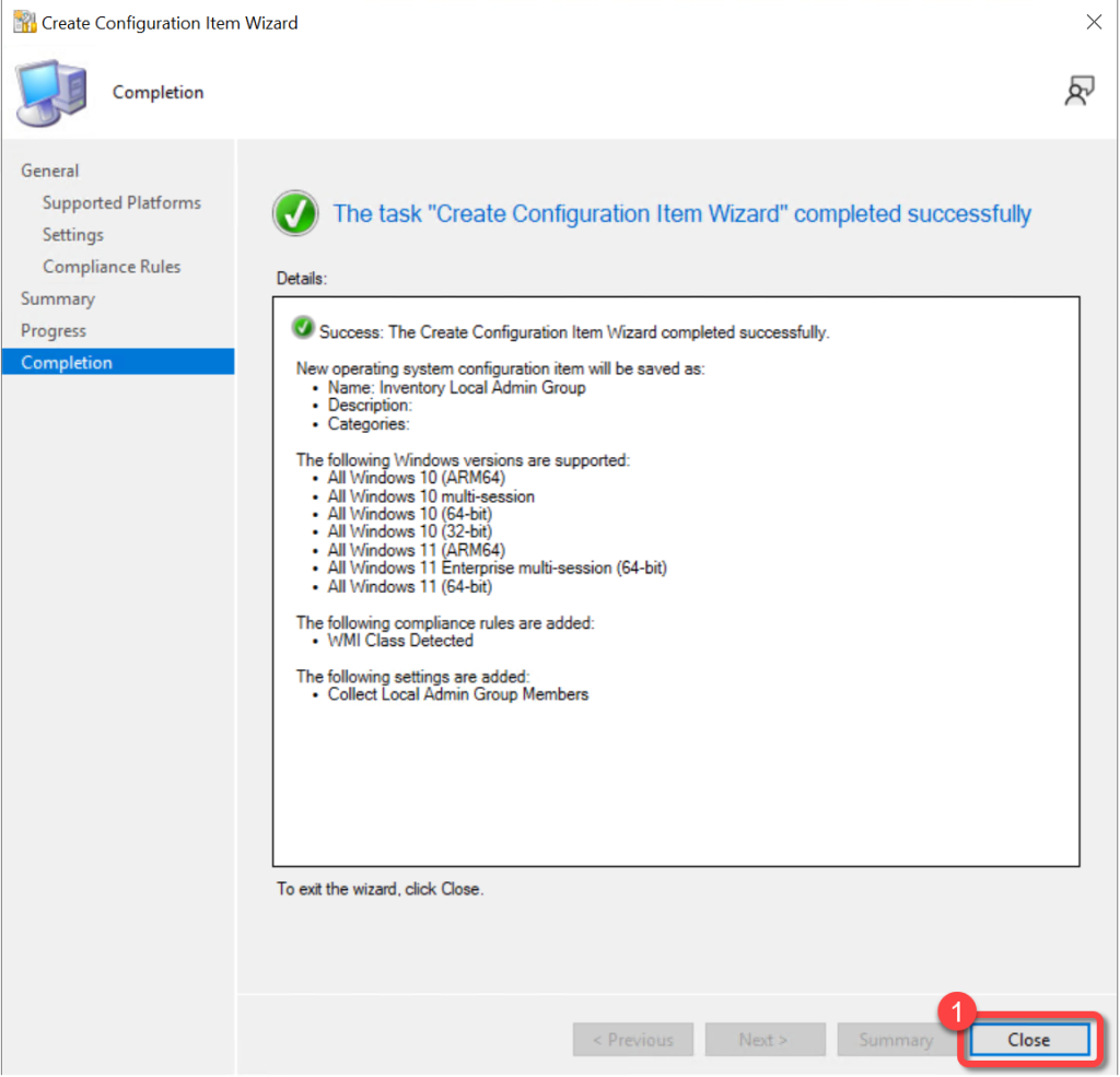 On the **Completion** tab of the **Create Configuration Items Wizard**, select **Close**.