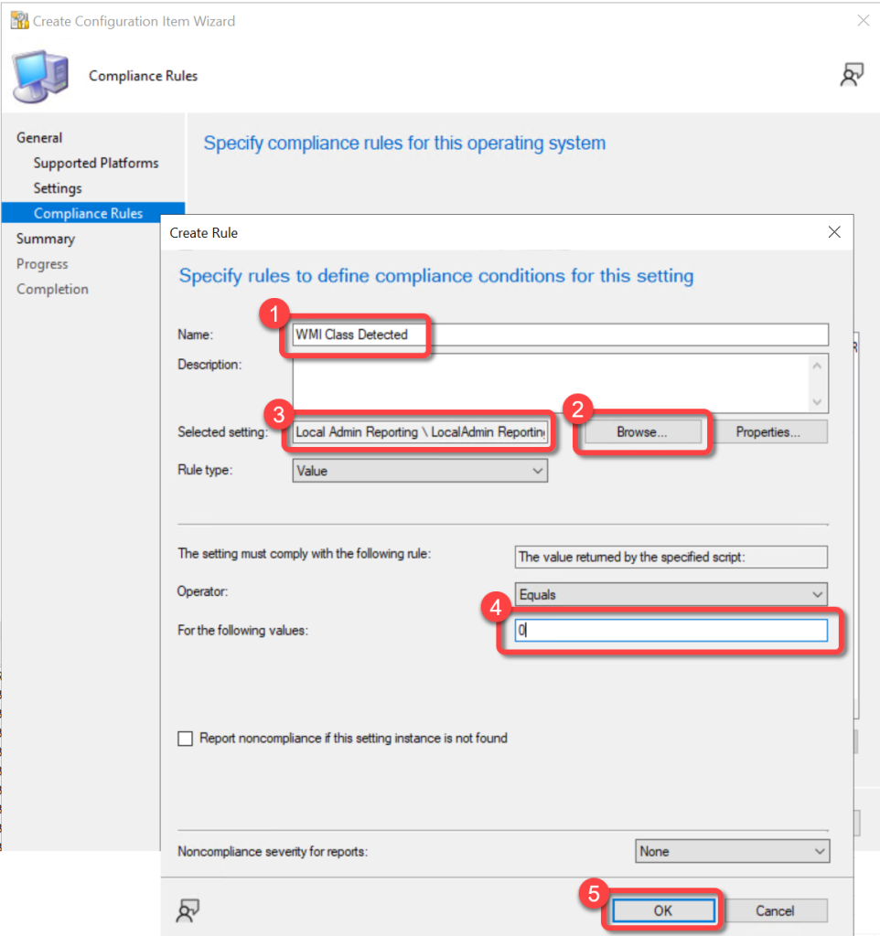 On the **Compliance Rules** page of the **Create Configuration Item Wizard**, select **New**.In the **Create Rule** dialog, provide the following information:**Name**: Enter a unique name for this rule. For example, "**WMI Class Detected**"**Selected setting**: Select **Browse** to open the **Select Setting** dialog. Select the setting that you created in Step 4 above and then choose **Select**.**Rule type**: Select **Value**.**Operator**: Select **Equals**.**For the following values**: Enter **0** (zero).Select **OK** to close the **Create Rule** dialog.