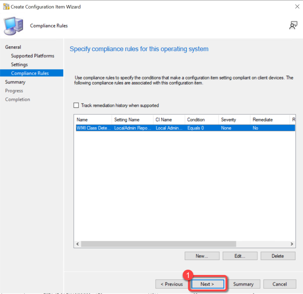 On the **Compliance Rules** tab of the **Create Configuration Items Wizard**, select **Next**.