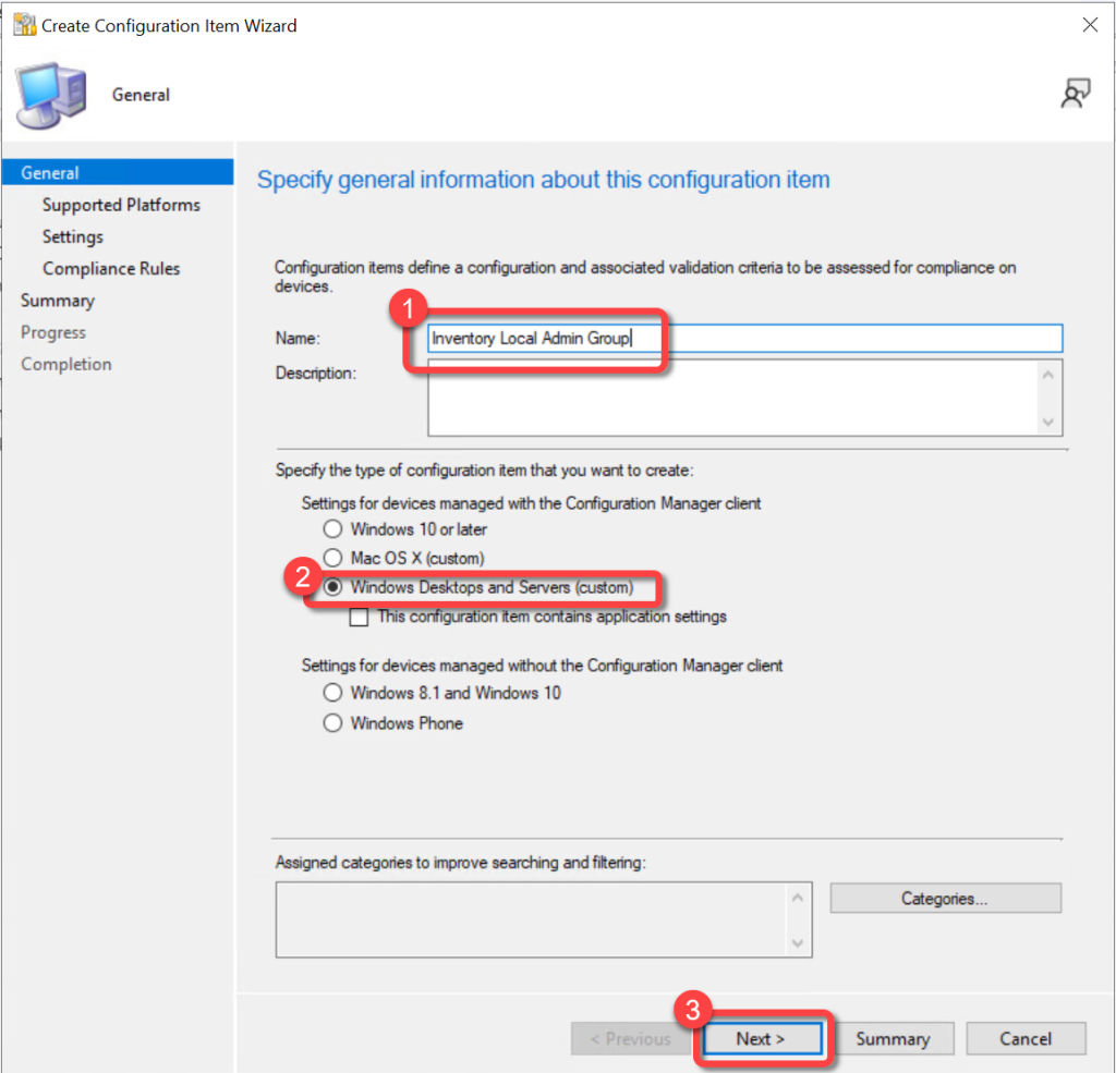 On the **General** page of the **Create Configuration Item Wizard**, specify a name for the configuration item.Under **Specify the type of configuration item that you want to create**, select **Windows Desktops and Servers (custom)**.Select **Next**.