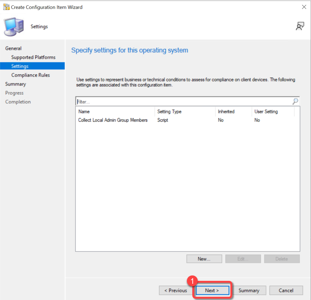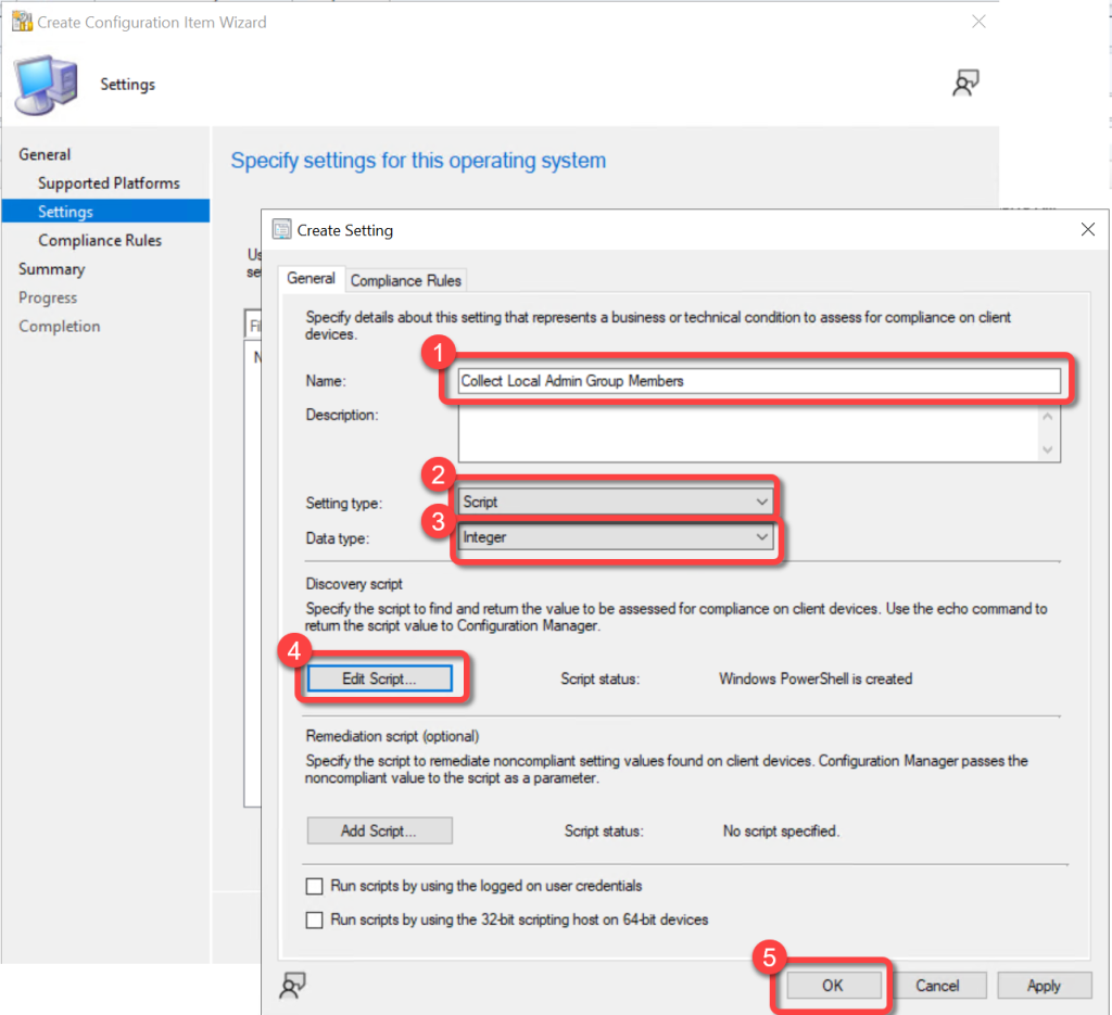On the **Settings** page of the **Create Configuration Item Wizard**, select **New**.On the **General** tab of the **Create Setting** dialog, provide the following information:**Name**: Enter a unique name for the setting. For example, "**Collect Local Admin Group Members**"**Setting Type**: Script**Data Type**: Integer**Discovery Script**: Paste in the contents of the PowerShell script from above.Select **OK**