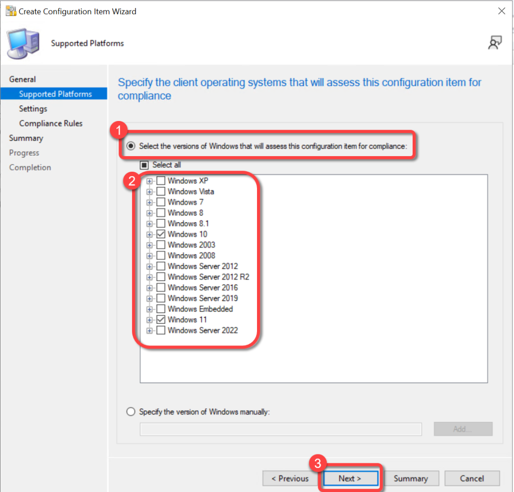 On the **Supported Platforms** page of the **Create Configuration Item Wizard**, specify the **applicable platforms** for which the item will be applied.Select **Next**.