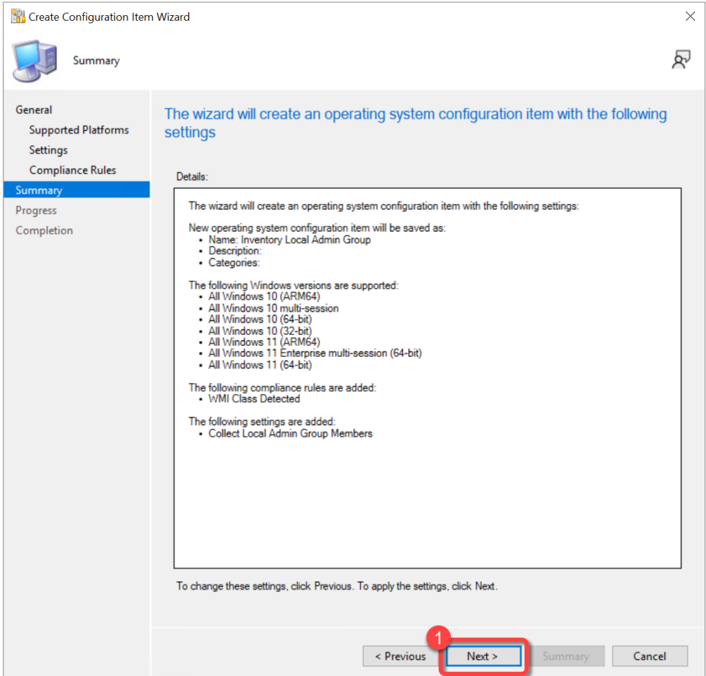 On the **Summary** tab of the **Create Configuration Items Wizard,** select **Next**.