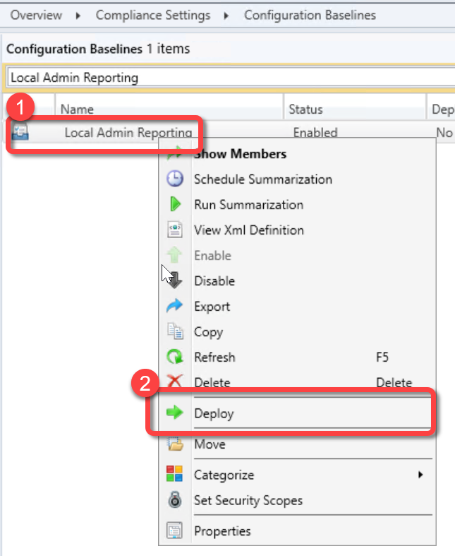 In the **Configuration Manager console**, go to the **Assets and Compliance** workspace, expand **Compliance Settings**, and select the **Configuration Items** node.In the **Configuration Baselines list**, select the configuration baseline that you created, right-click, select **Deploy**.