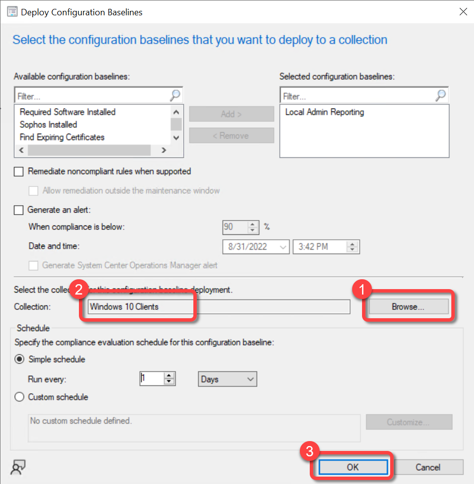 Select **Browse** to select the **collection** where you want to deploy the configuration baseline.Select **OK**.