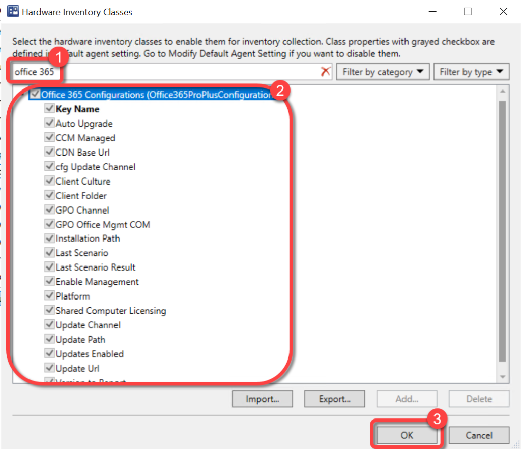 - In the Hardware Inventory Classes dialog, use the Search for inventory classes field to search for the Office 365 Configurationsclass.