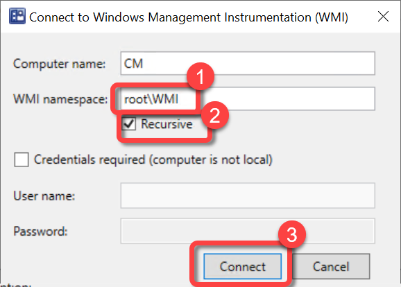 - In the Connect to Windows Management Instrumentation (WMI) dialog, specify the rootWMI namespace and select Recursive.