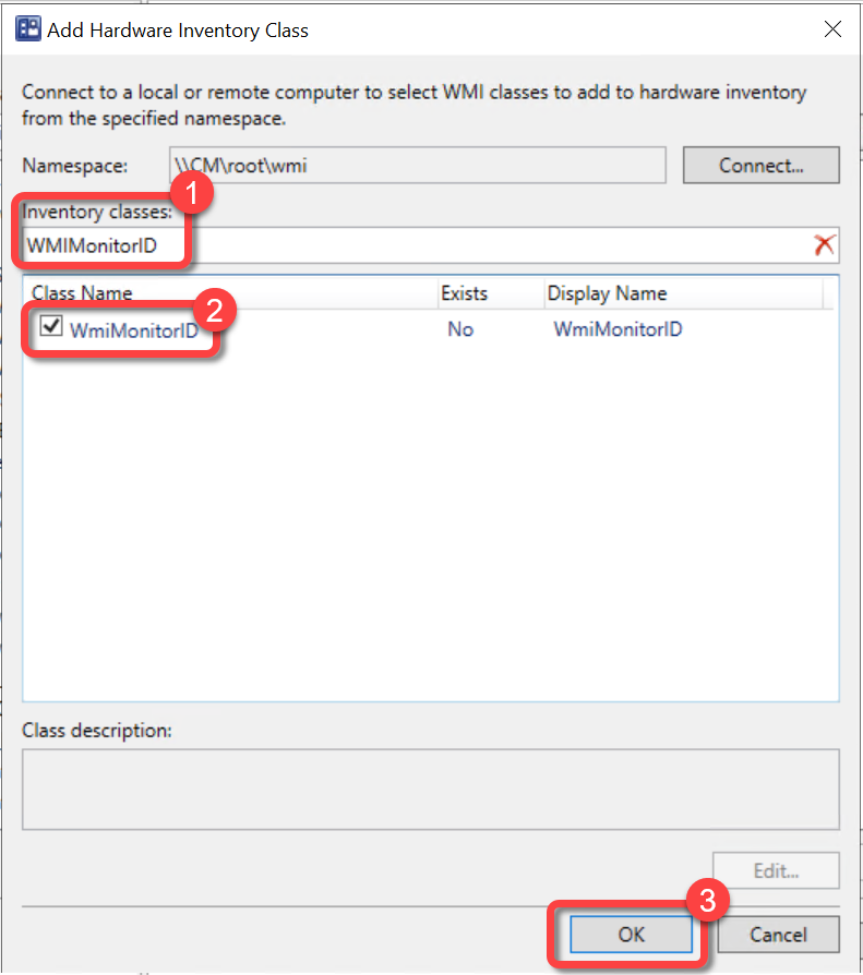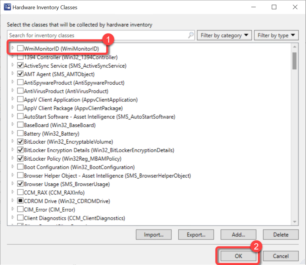 - In the Hardware Inventory Classes dialog, you might want to clear the WMIMonitorID and add it to a custom client agent setting instead. Using a custom client agent setting is typically advised however it is not covered in this document. If you would like to have the monitor inventory collected using the Default Client Settings do not clear WMIMonitorID here.