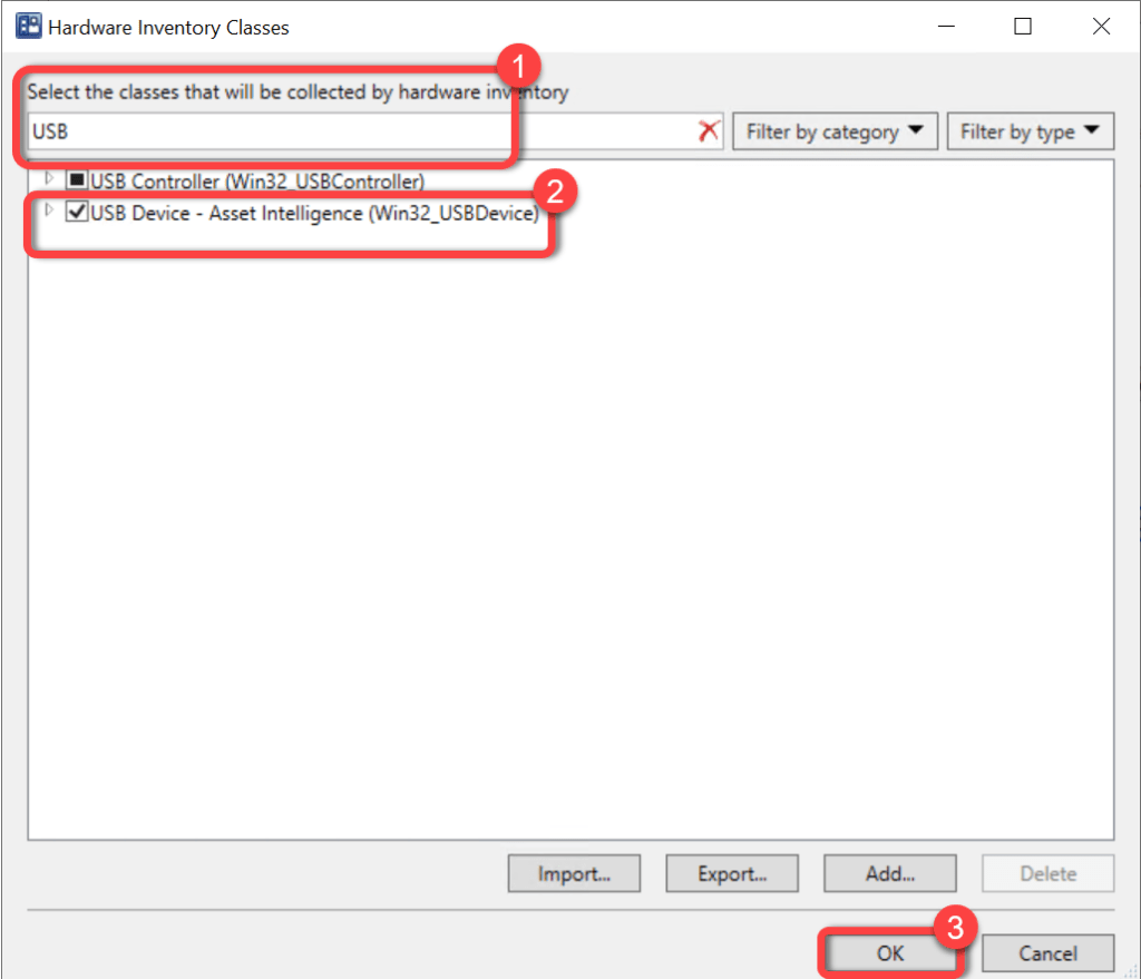 - In the Hardware Inventory Classes dialog, use the Search for inventory classes field to search for the USB Device - Asset Intelligence (Win32_USBDevice) class.
