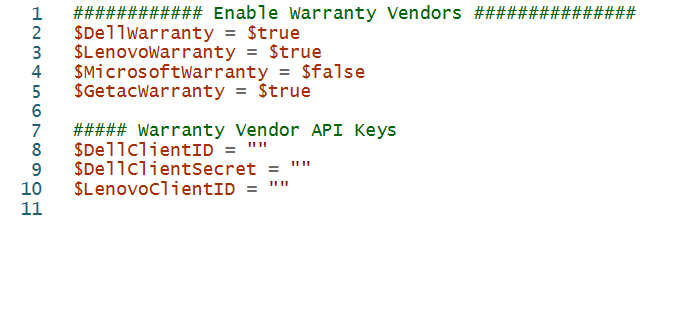 - Enable or disable each of the manufacturer's warranty collection in the Enable Warranty Vendors section by entering either $true or $false.