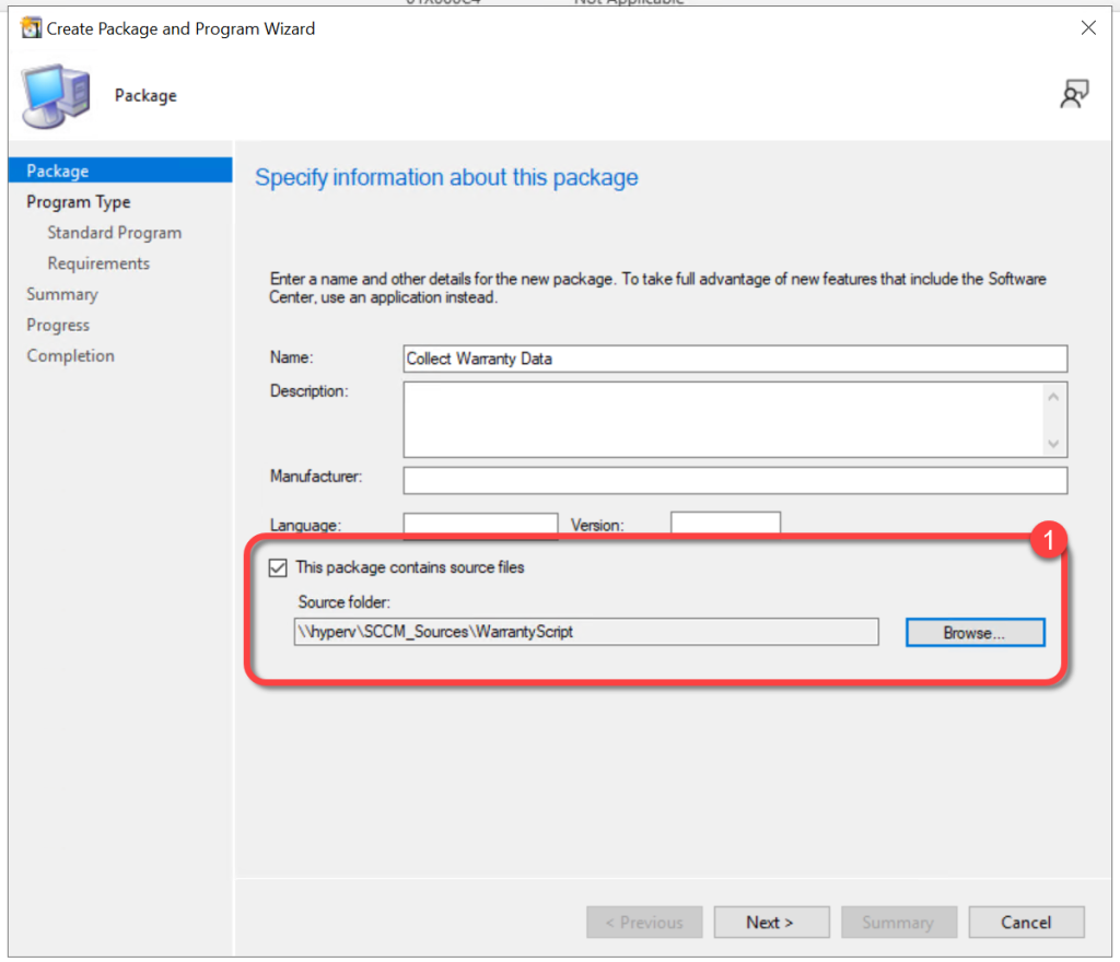 - In ConfigMgr create a software package pointing the source to the directory containing the PowerShell script.