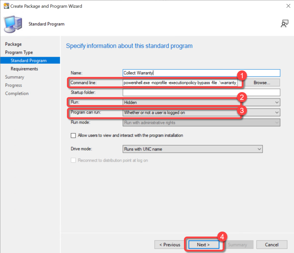 - In the package create a program to run the PowerShell script. As an example, the command line that to be run should look similar to this: powershell.exe -noprofile -executionpolicy bypass -file .warranty_info.ps1