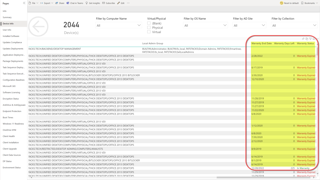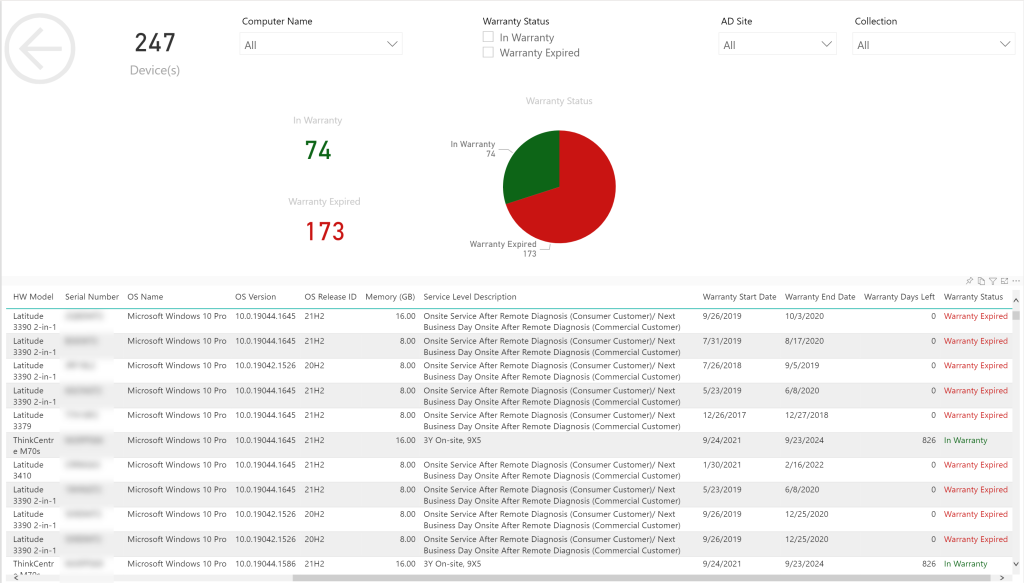 - Once devices have run the package, hardware inventory has been run, and Power BI has run a sync you will see the warranty data on the default Device Details page.