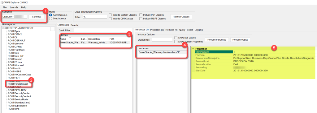 - After running the script manually on a computer use WMI Explorer to confirm that the data has been populated.