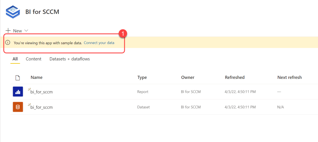 - Upon opening the BI for SCCM workspace you may notice a banner that says, "You're viewing this app with sample data. Connect your data." This can be safely ignored. If you'd like to try BI for SCCM before connecting your data it installs with sample data. If you prefer to go ahead and see your own data proceed to the next step in our documentation.