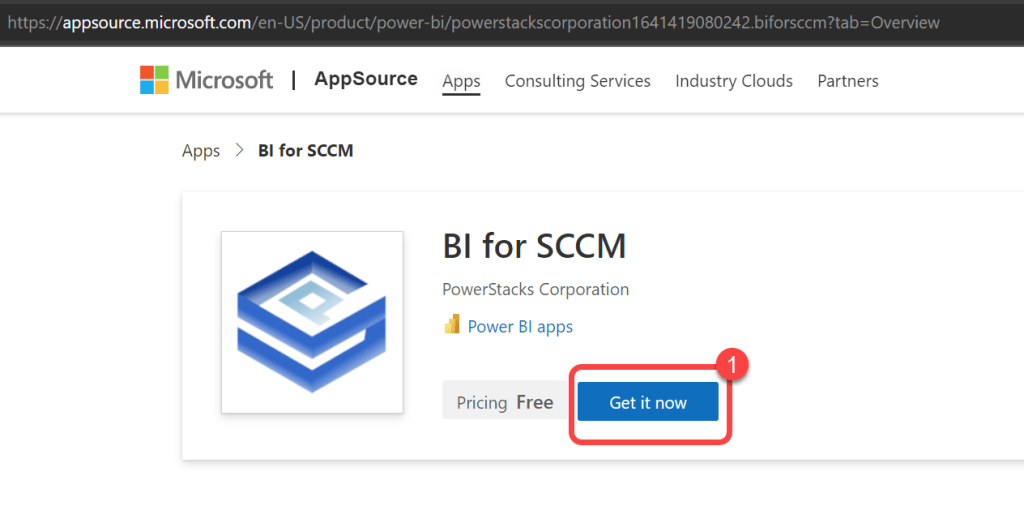 - On the BI for SCCM page in Microsoft AppSource select Get it now.