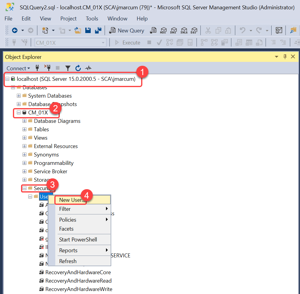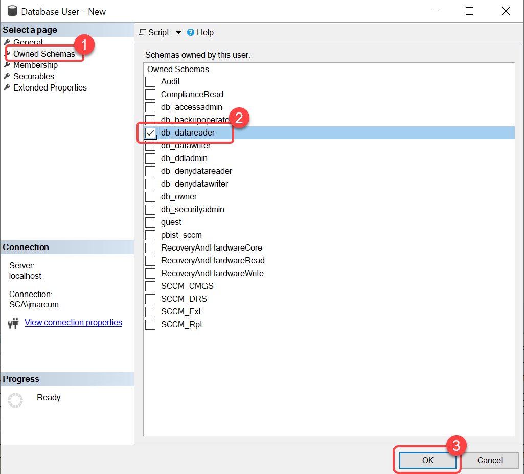 To read data from the ConfigMgr database an account with at least read access to the database is required. This can be an Active Directory user or a SQL user account. In this example we are using an Active Directory user account. As a best practice this account should be a dedicated service account following the principle of least privilege.