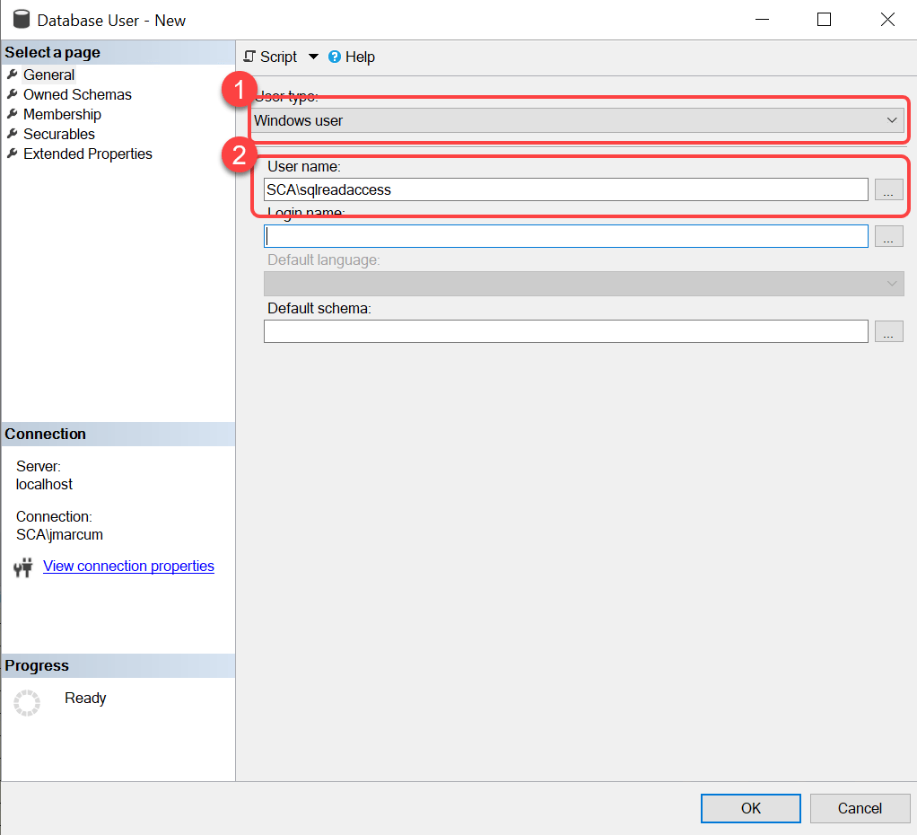 - Enter the User name for the database reader account. If you have chosen Windows user from the User type list, you can also select the ellipsis (...) to open the Select User or Group dialog.