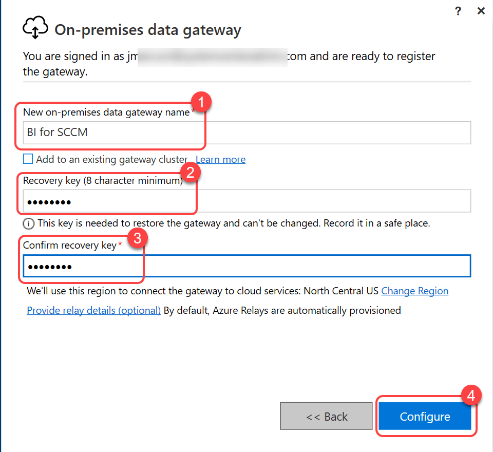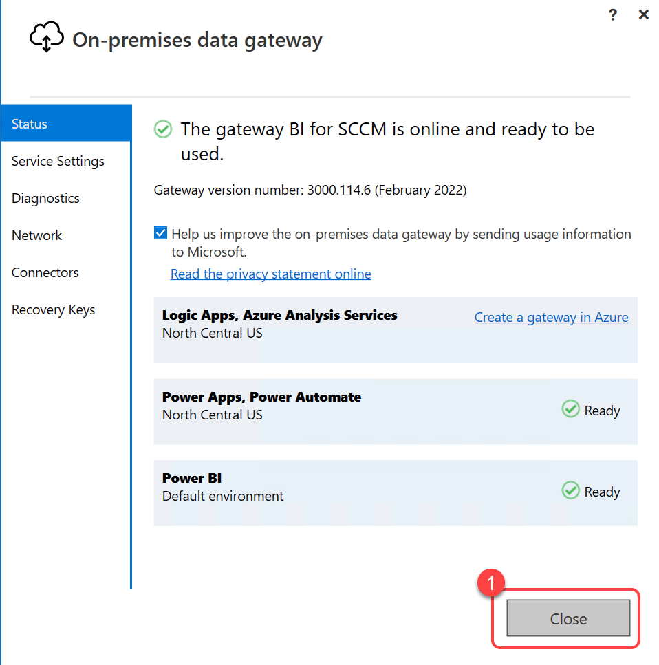 A Microsoft Power BI date gateway an app that you install in on an on-premises device. The on-premises data gateway acts as a bridge to provide quick and secure data transfer between the ConfigMgr SQL database and the Power BI service. There are two data gateway types; personal and standard. Only the standard gateway is supported by BI for SCCM. Most customers install the gateway on the ConfigMgr primary site server or the CAS. .NET Framework 4.8 is required for the gateway. If .NET Framework 4.8 is not already installed a reboot is required to install it. If .NET Framework 4.8 is installed no reboot is required when installing the gateway. The gateway is available from Microsoft here. It is very important to keep the gateway app updated, a new version is released each month and there is no way to configure it to auto update. Many customers experience data synchronization failures due to not updating the gateway, for this reason we recommend updating the gateway app at least every 3 months.